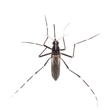Asian Tiger Mosquito: Black with distinctive white stripes on the thorax and legs. A single white stripe down the middle of the back of the thorax.