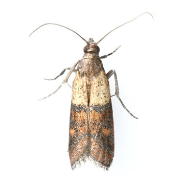 Indian Meal Moth: Bi-color wings, outer half reddish-brown, inner half gray color.